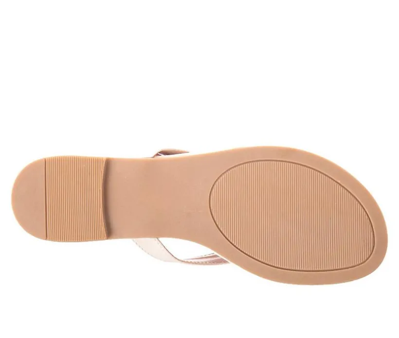 A minimalist thong sandal with a delicate touch of shine. Made with a faux leather upper and a classic toe-post construction, this flat style is accented with a small metallic charm at the center for a subtle, feminine finish. Perfect for warm-weather styling with relaxed or dressy looks.