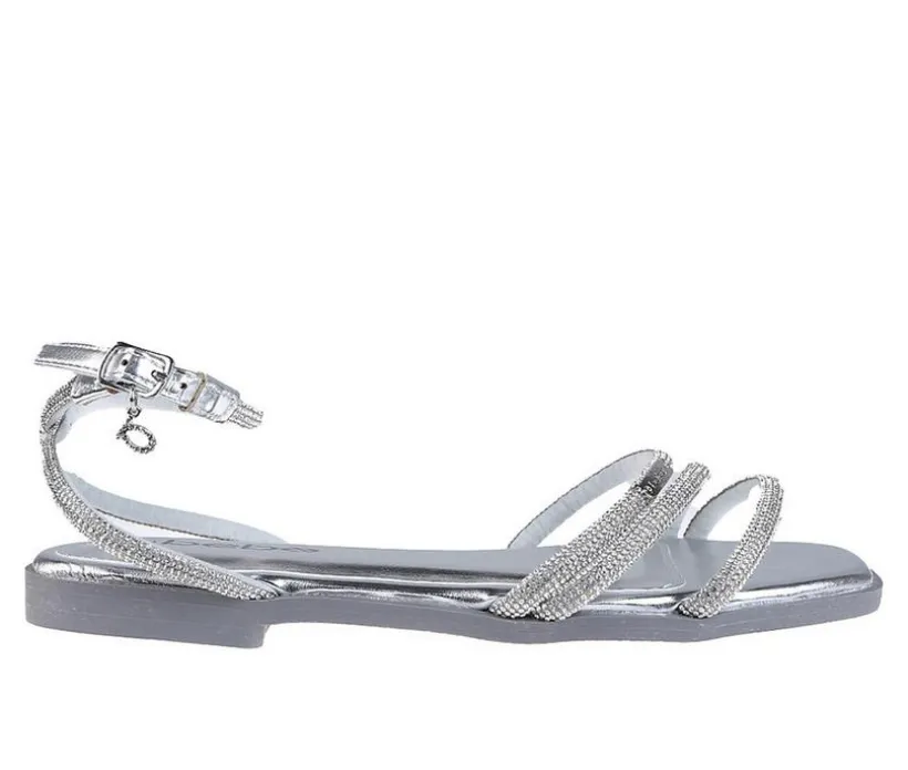 A sleek dress sandal with shimmering straps and a modern silhouette. Made with a metallic faux leather upper, this style features rhinestone-covered straps and a wraparound ankle strap for a secure, stylish finish. Perfect for adding sparkle to any special occasion or night out.