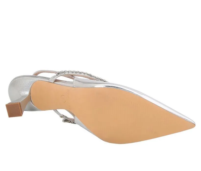 Polish your evening look with these pointed-toe slingback heels, designed to turn heads with their sleek finish and sculpted heel. A sparkling embellished strap adds just the right amount of glamour across the instep, while the low flared heel brings modern elegance and stable elevation. Ideal for dressy events or elevated everyday wear.