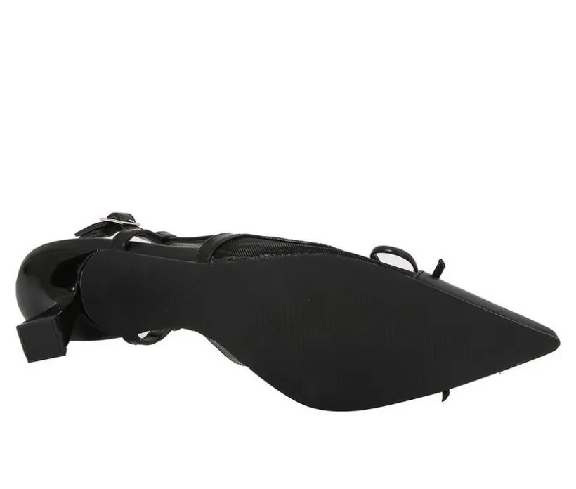 Vintage charm meets structured femininity in this slingback kitten heel with a striking two-tone design. The closed pointed toe and sheer mesh panels create a flattering frame around the foot, while a dainty bow and grosgrain trim lend soft detail. A low sculpted heel and thin slingback strap make it perfect for day-to-evening occasions.