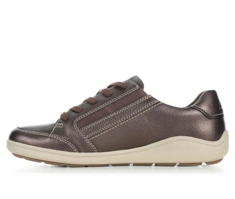 The Clarks Bryianna Bayla Sneaker is built for modern comfort with a polished finish. Designed with a metallic leather upper, it features both lace-up styling and a side zipper for easy on and off. A cushioned insole provides all-day support, while the lightweight midsole helps absorb impact with every step. Finished with a flexible rubber outsole, this sneaker blends everyday comfort with sleek, versatile style.