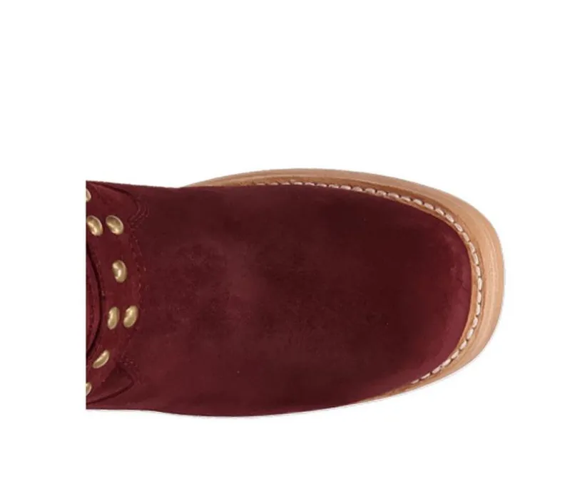 Western meets edgy in this tall boot detailed with metal studs and a wraparound harness strap. Crafted from a soft faux suede upper, it blends cowboy inspiration with bold attitude, anchored by a block heel and pull-on shaft for easy everyday wear.
