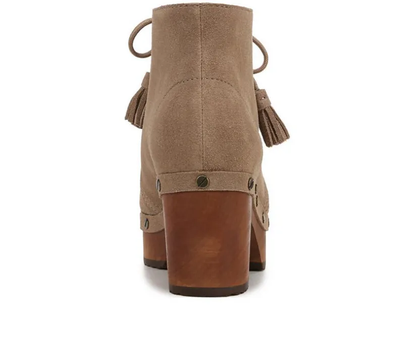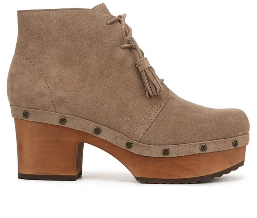 Vintage-inspired clog boots for women with forever original style. SUSTAINABLY CRAFTED: Fabric linings and topcloth partially made from recycled plastic bottles; partially recycled toe box and heel counter. MATERIALS: Suede leather upper responsibly sourced from Leather Working Group certified tanneries. FIT: Lace up closure for secure fit. SUSTAINABLE COMFORT: Anti-microbial, anti-odor Insole Technology with cushioning, comfort, & arch support that uses 15% cushy plant-based BLOOM® foam insole. MOVEMENT: Lightweight, flexible construction moves with you. STYLE: Womens lace up booties with tassel and stud detailing, round toe, 2 3/4 inch real wood heel and midsole with 1 1/3 inch platform, and rubber sole plate. 1 SHOE. 1 TREE. ALL THE FEELS: With your purchase of this shoe, we’ll donate one tree to Trees for the Future to offset carbon emissions and help impoverished families plant trees for a better life. CONSCIOUSLY PACKAGED: This style is shipped in an environmentally preferred 1-piece box made with primarily recycled materials that can be recycled & soy-based inks. Always iconic. Inspired by the wood sole sandal that started it all, these comfortable platform booties are the epitome of chic.