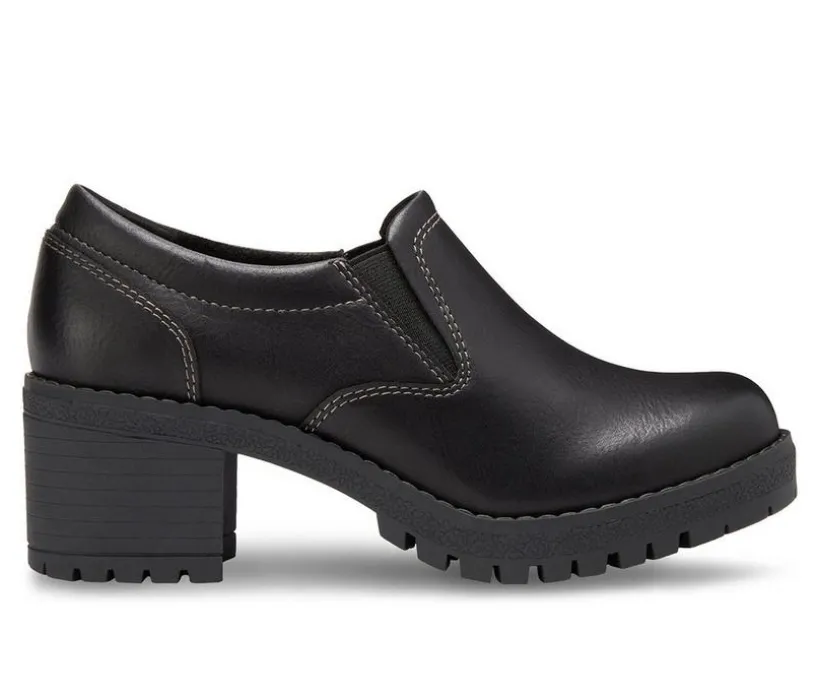 These slip-on oxfords deliver a polished, wear-anywhere look with comfort built right in. The smooth synthetic upper pairs with hidden elastic goring to create an easy, adaptable fit that moves naturally with your foot. A cushioned memory foam insole adds supportive softness for all-day wear, while the low block heel provides a subtle lift without compromising stability. Finished with a durable TPR rubber outsole and a classic round toe, this style blends timeless oxford details with effortless everyday comfort.