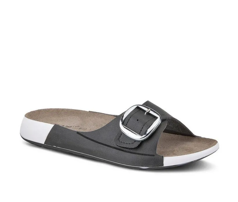 Flat oval slide sandal with silver square buckle for adjustability on comfortable footbed.