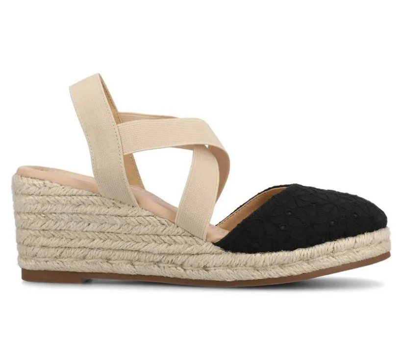 The Ashlee espadrille wedge sandal from Journee is the perfect summer footwear for everyday wear. It features a stylish pull-on design and a 2 3/4-inch heel that ensures easy slip-on convenience. Crafted from soft fabric, its multi-strap construction not only adds a touch of elegance but also provides a secure fit, while the round-toe shape enhances comfort for all-day wear. Additionally, the cushioned footbed offers exceptional support, making these sandals an ideal choice for those seeking both fashion and functionality during the warm months.