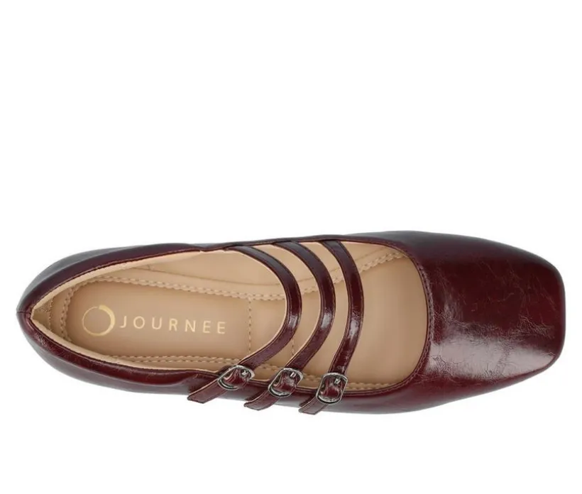 The Darlin Mary Jane flat from Journee Collection features a stylish and comfortable design with a flat sole, making it a versatile choice for everyday wear. The multi-strap detailing with a buckle closure adds a trendy touch, enhancing the square toe style and providing a secure fit. Crafted with faux leather for the upper material and man-made outer sole, and equipped with a 4 mm Tru Comfort Foam™ footbed, these flats prioritize both fashion and comfort for a chic and practical footwear option.