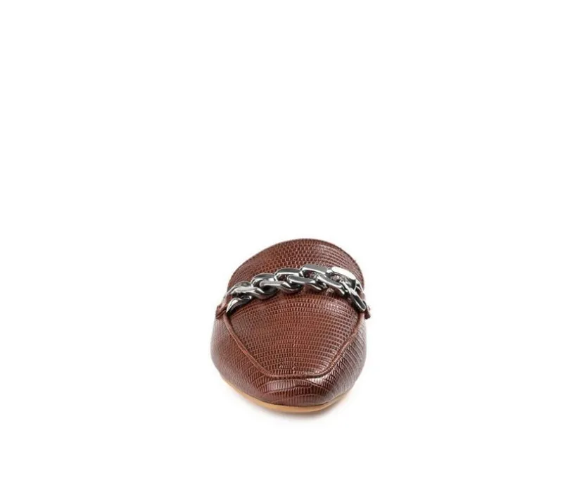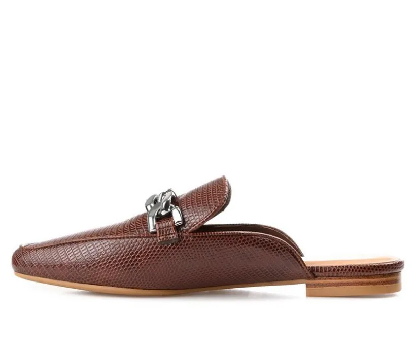 The Hazina by Journee Collection is just the versatile mule flat that can handle your Monday through Sunday looks. This square toe mule is embellished with a silver-tone chain accent and a notched topline. Lizard textured vegan leather shapes the silhouette, while a 4 Tru Comfort Foam™ footbed makes them oh-so-comfy.