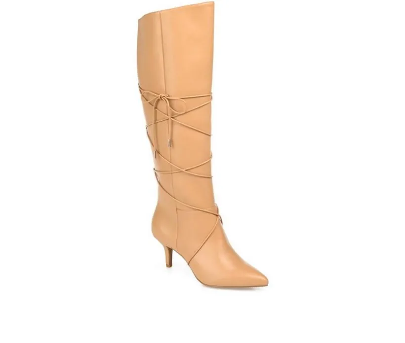 The Kaavia boots by Journee Collection are undeniable proof that pointed-toes and kitten heels have always been a stylish combo. This knee-high boot will add a chic finish to any look with its wrap-around strap detail and pointed-toe. A supportive 4 mm Tru Comfort Foam™ insole, soft vegan leather, and walkable heel finish this wide-calf style.