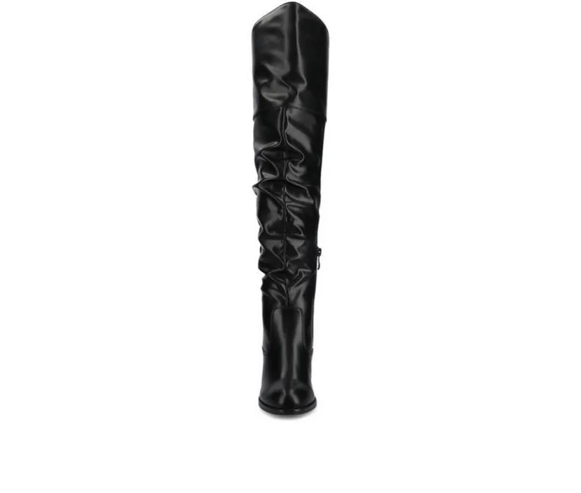 The Kaison is a ruched over-the-knee boots by Journee Collection is constructed with soft faux suede uppers that rise over the knees with raised vamps that create stylish detail. A rounded toe and stacked chunky high-heels finish the design