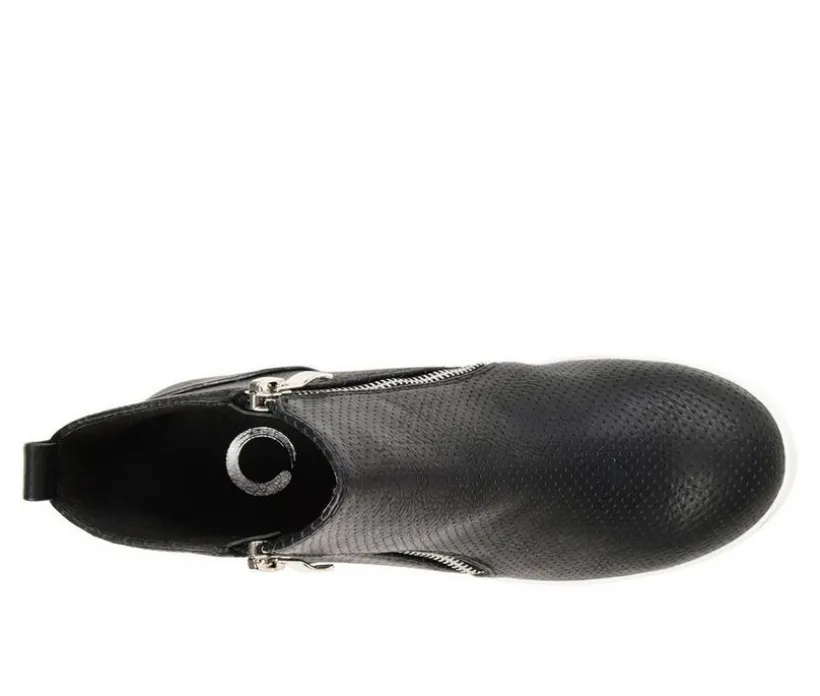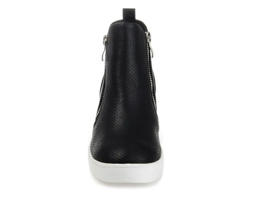 Need a lift? The Pennelope sneaker by Journee Collection features a lofty hidden wedge heel lined with a cushioned footbed for a comfortable elevation. Round perforations cover this vegan leather design, and silver tone zippers at the sides finish the look.
