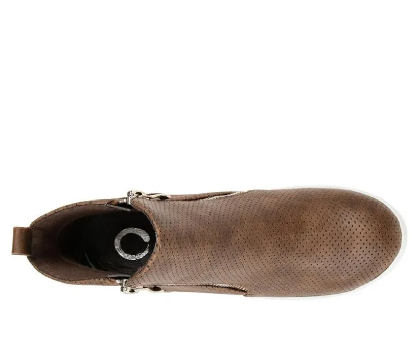 Need a lift? The Pennelope sneaker by Journee Collection features a lofty hidden wedge heel lined with a cushioned footbed for a comfortable elevation. Round perforations cover this vegan leather design, and silver tone zippers at the sides finish the look.
