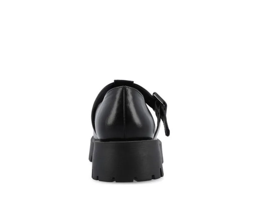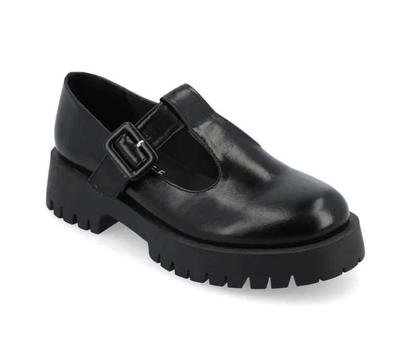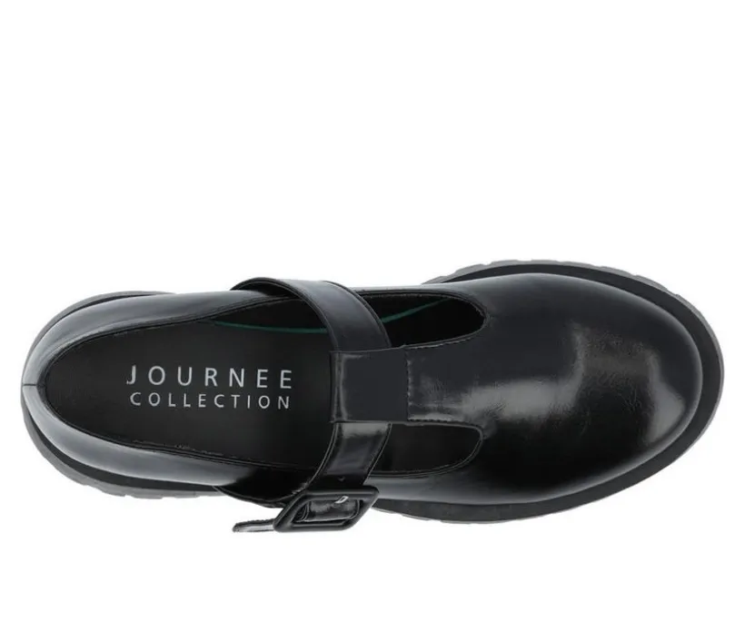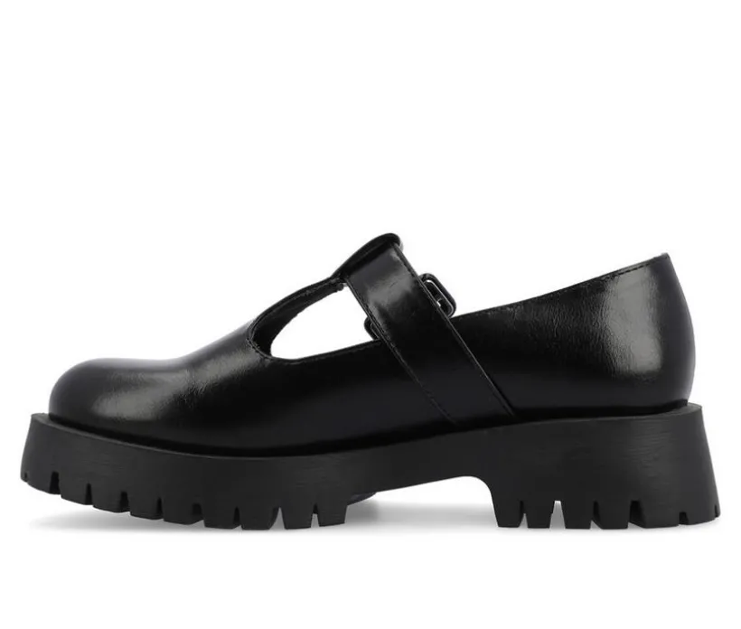 Introducing Suvi by Journee Collection, a classic flat with a twist. These 90s-style T-strap mary jane flats have a round toe and a buckle detail. Made of high-quality vegan leather, these shoes are both fashionable and easy on the feet. The 1 1/2-inch chunky treaded sole provides plenty of grip and stability, while the 4mm Tru Comfort Foam™ insole ensures all-day comfort.