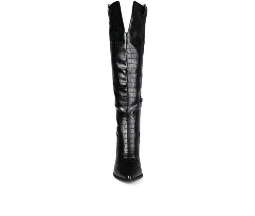 Bustling city vibes and country comfort combine with the Therese boot by Journee Collection! Croc textured vegan leather and a stacked block heel detail this knee-high boot for a fresh look. This rodeo-inspired design features a 4 mm Tru Comfort Foam™ insole and an extra-wide calf for comfortable wear.