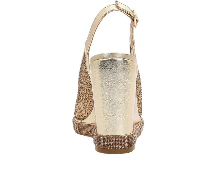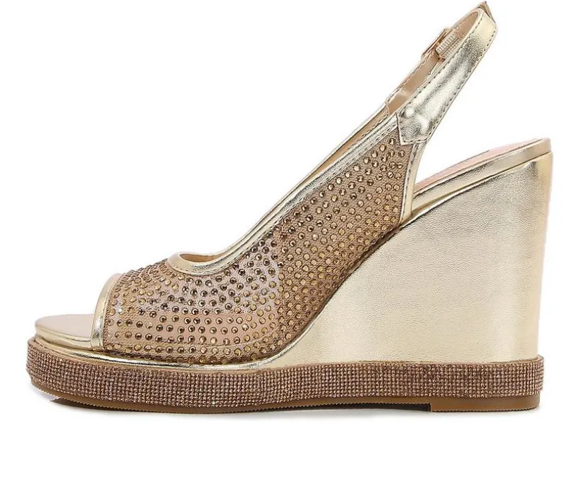 Glittering style meets height-boosting comfort in this statement wedge sandal perfect for dressing up your summer events. Designed with a shimmering mesh-textile upper and a peep toe front, it delivers breathable glamor with every step. The slingback strap with adjustable buckle keeps the fit secure, while the jeweled platform and tall wedge heel add drama without compromising balance. It’s the perfect pick for weddings, parties, and polished nights out.