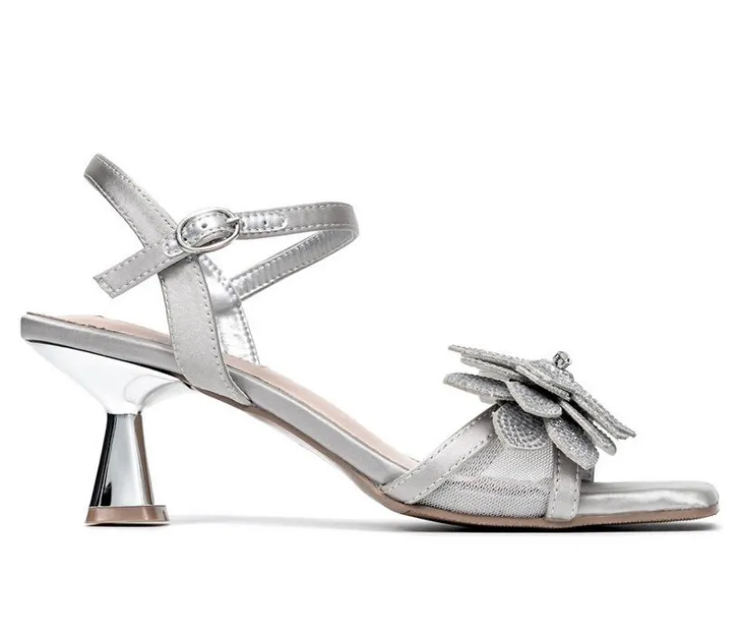 Glitz, glam, and garden party charm come together in this dazzling sandal built for festive occasions. A bold layered floral accent graces the front strap, adding texture and eye-catching sparkle to every step. The shimmery upper and sculpted heel create an elegant silhouette, while the open toe and adjustable ankle strap offer breathable comfort and a custom fit. Perfect for weddings, dances, or nights out, this style turns any outfit into a showstopper.