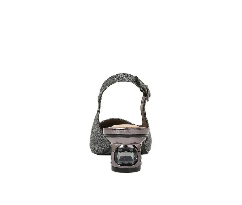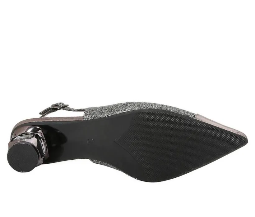 Bring runway flair to your evening ensemble with these dazzling heels that redefine statement style. A glittery upper with a glossy pointed toe commands attention, while the sculpted heel embedded with gems delivers bold personality from every angle. The slingback design offers a secure fit with an adjustable buckle, combining elegance and edge in one refined silhouette. Perfect for formal events or a night out, these heels are made to sparkle and impress.
