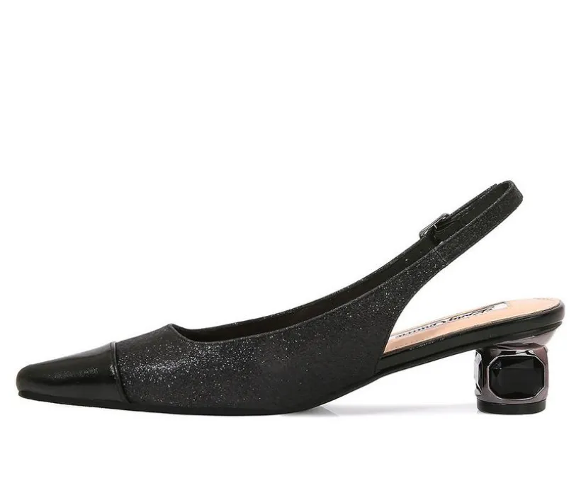 Bring runway flair to your evening ensemble with these dazzling heels that redefine statement style. A glittery upper with a glossy pointed toe commands attention, while the sculpted heel embedded with gems delivers bold personality from every angle. The slingback design offers a secure fit with an adjustable buckle, combining elegance and edge in one refined silhouette. Perfect for formal events or a night out, these heels are made to sparkle and impress.