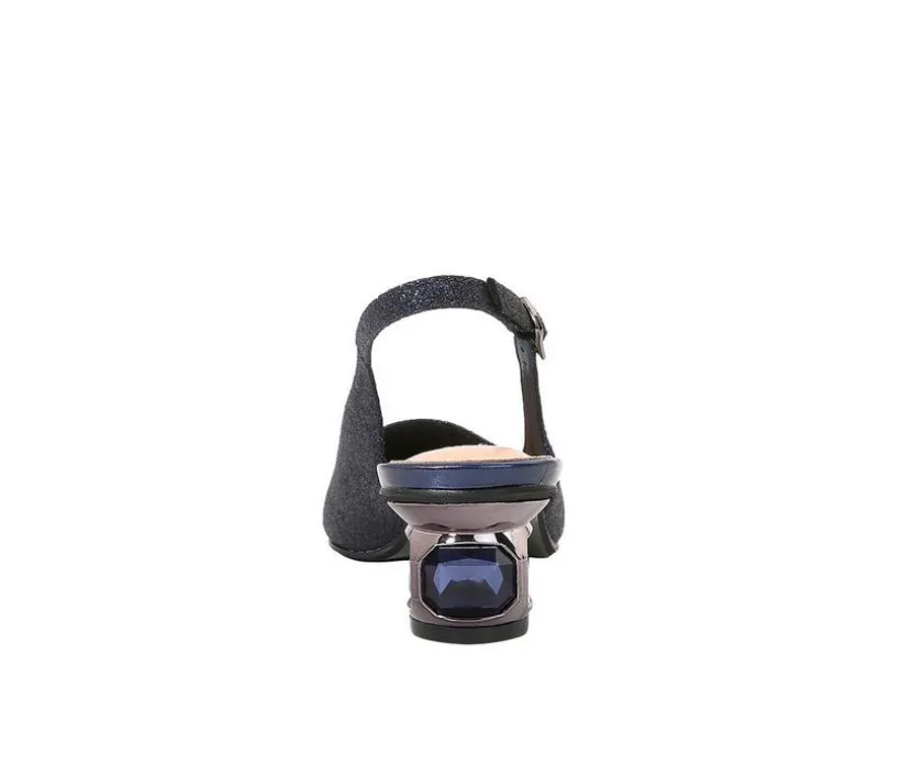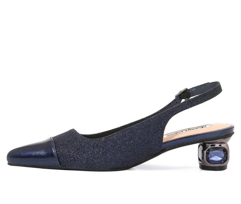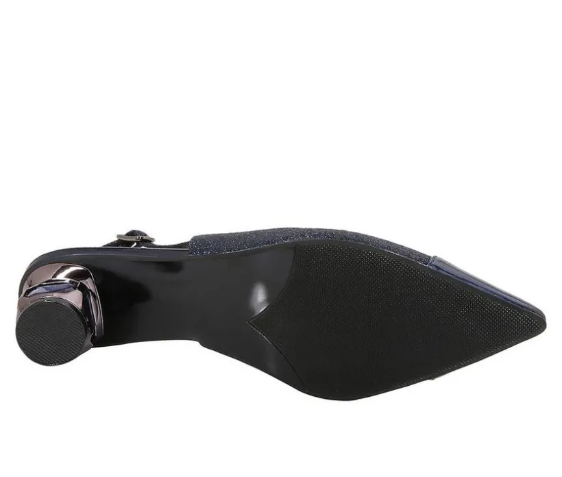 Bring runway flair to your evening ensemble with these dazzling heels that redefine statement style. A glittery upper with a glossy pointed toe commands attention, while the sculpted heel embedded with gems delivers bold personality from every angle. The slingback design offers a secure fit with an adjustable buckle, combining elegance and edge in one refined silhouette. Perfect for formal events or a night out, these heels are made to sparkle and impress.