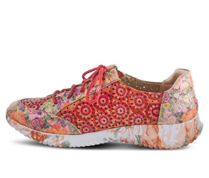L’Artiste Style: JAZZIE. A lightweight sneaker that will put a spring in your step. This sneaker style casual has leather laser circle cutouts, lace up straps and a beautiful faux leather metallic pattern that matches a fun floral print on the outsole. The gentle wedge slope offers not only a lift but the ultimate in all day comfort. Upper: Genuine and man-made leather combination. Lining: Synthetic. Insole: Synthetic. Outsole: Rubber. Closure: Lace-up. Heel Height: 1.25″. Wedge Height: 3/4″. Features: Adjustable, Comfort, Hand-painted, Removable Insole. Disclaimer: L’Artiste products are made with natural tanned leather using traditional hand painting techniques. This unique finishing process is used to create a natural effect with color variations to deliver authentic look and beauty.