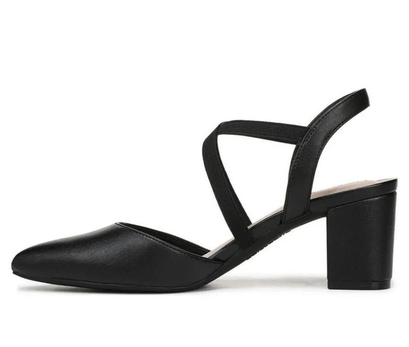 Discover the perfect fit in these timeless and comfortable women’s slingback heels with stretch straps. Faux leather or microfiber upper with a softly pointed toe, slip-on fit with stretch elastic straps, and slingback strap. Linings crafted from partially recycled materials. Soft System® comfort package provides all-day support, flex, and cushioning. Traction sole for extra stability. Just Right Height 2 3/8 inch block heel.
