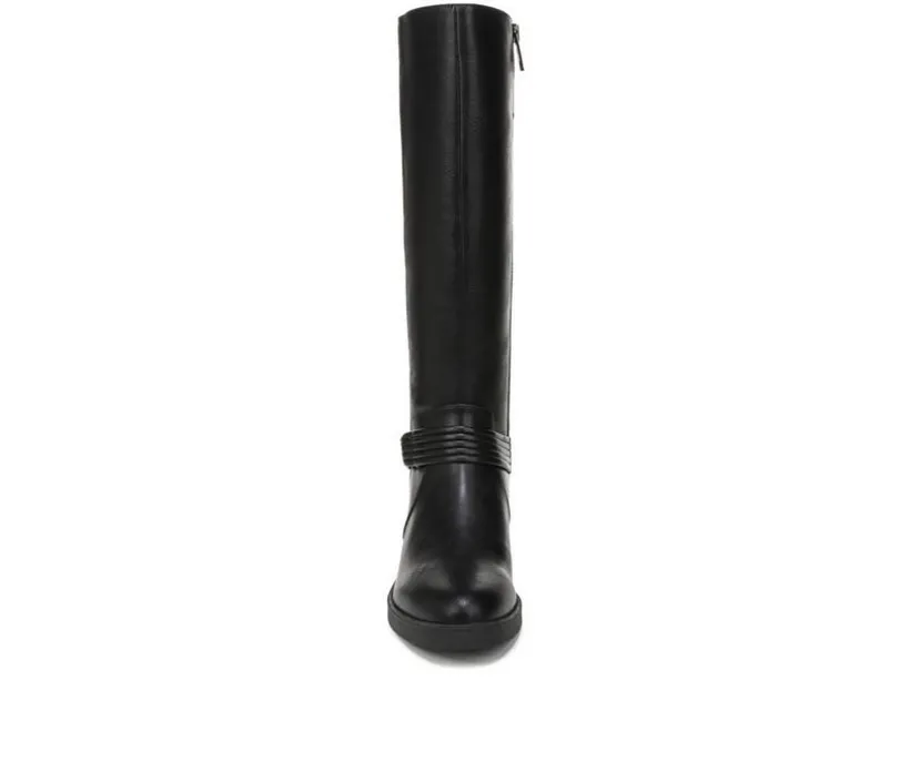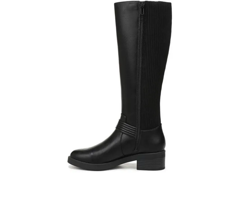 A refined take on a classic tall boot, this style blends sleek design with everyday comfort. Crafted with a faux leather upper, round toe, and a decorative strap with metallic ring detail, it’s both versatile and polished. The stretch knit back panel ensures a flexible fit, while the inside zipper makes it easy to slip on and off. Soft System® comfort technology delivers cushion and support, and the traction sole keeps every step steady atop a 1 3/4″ block heel.