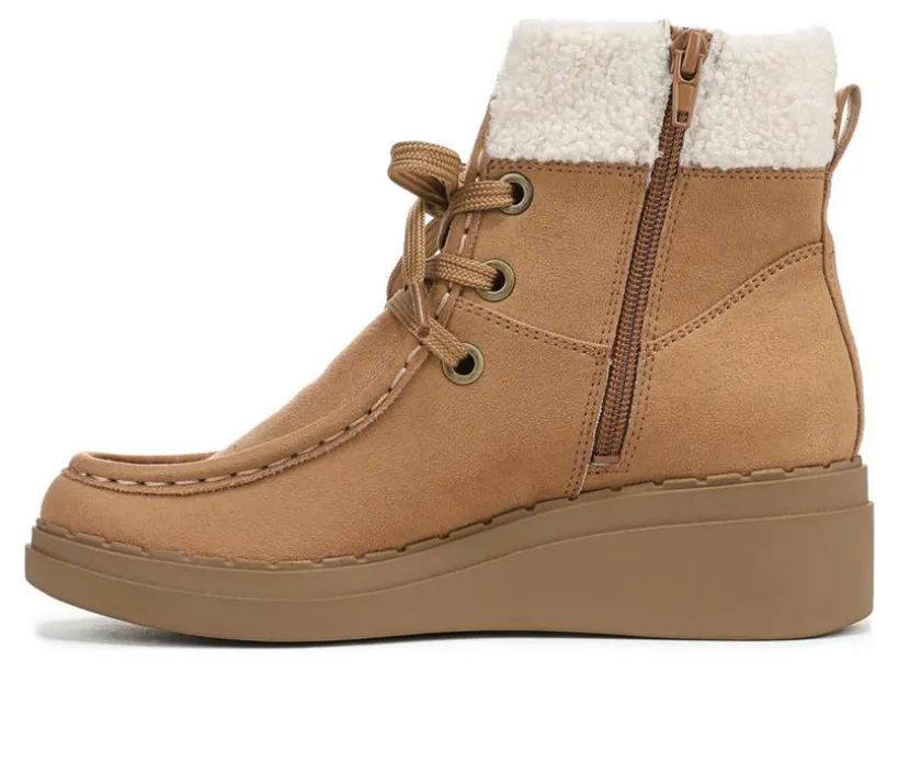Designed to bring cozy comfort and standout style to cool-weather days, this wedge ankle bootie is the perfect mix of casual flair and supportive lift. The soft synthetic upper features moc-toe stitching and bold metal eyelets, while a lace-up front allows for a customizable fit. A sweater-knit collar adds a warm, textured touch around the ankle, and the cushioned insole ensures comfort all day long. The low wedge sole gives you just the right boost with stable support for every step.