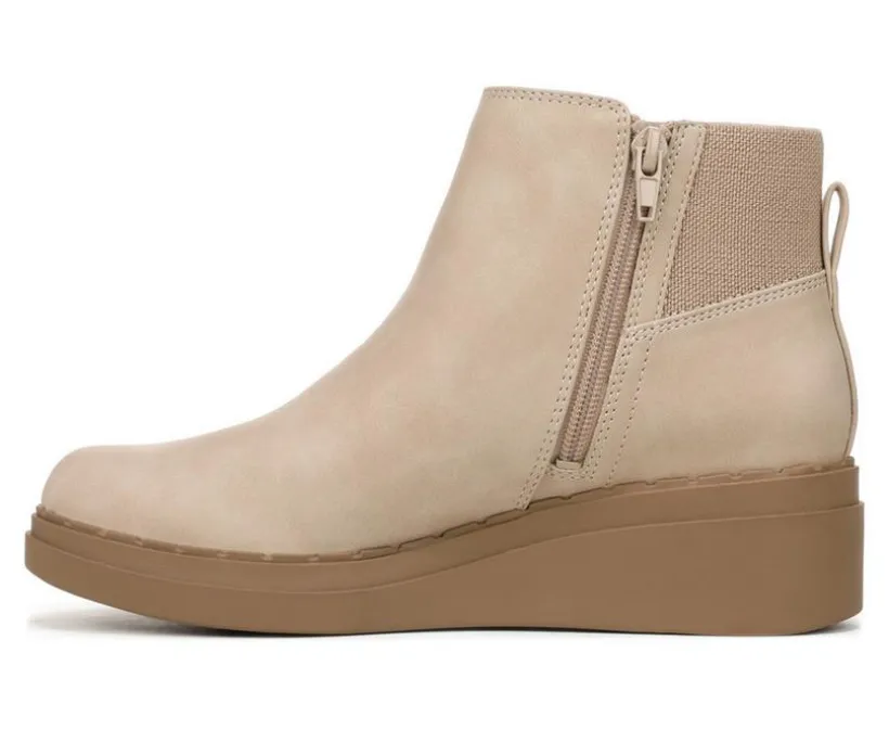 This wedge ankle boot blends a sleek silhouette with supportive comfort, making it a smart pick for cooler days and everyday wear. The synthetic upper features a clean, modern profile with dual side stretch panels for easy slip-on convenience. A cushioned insole softens each step, while the low wedge heel provides subtle lift and stable support. Finished with a pull tab at the heel and a flexible outsole, this boot delivers both comfort and versatility in one stylish package.