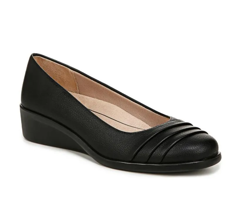 Looking put together has never been so easy in these incredibly versatile slip on shoes with a flattering wedge and exceptional arch support. Faux leather upper with a round toe, slip-on fit, foldover detail at the toe, and lightweight and flexible design. Linings crafted from partially recycled materials. Soft System® comfort package provides all-day support, flex, and cushioning. Active Arch® contoured insole with extra arch support and cushioning. Traction sole for extra stability. Just Right Height 1 5/8 inch wedge heel.