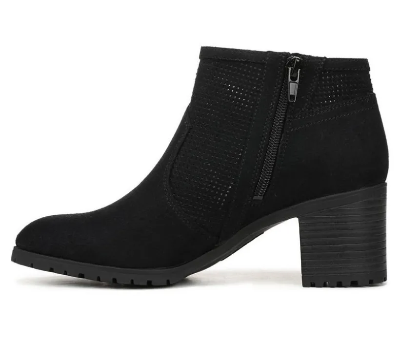 These ankle booties stand out with chic perforated detailing and a streamlined round-toe design. Crafted with a microsuede upper and finished with an inside zipper, they combine convenience with a polished look. A sturdy block heel completes the silhouette, making them a versatile choice for day-to-night outfits.