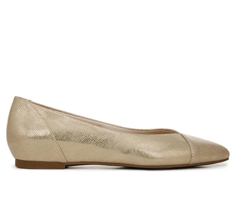 Classic and chic, this pointed-toe ballet flat is unmatched for comfort and versatility. Faux leather with a pointed toe, slip-on fit, and mixed-material design on select styles. Linings crafted from partially recycled materials. Soft System® comfort package provides all-day support, flex, and cushioning. Traction sole for extra stability. Just Right Height 3/4 inch heel.