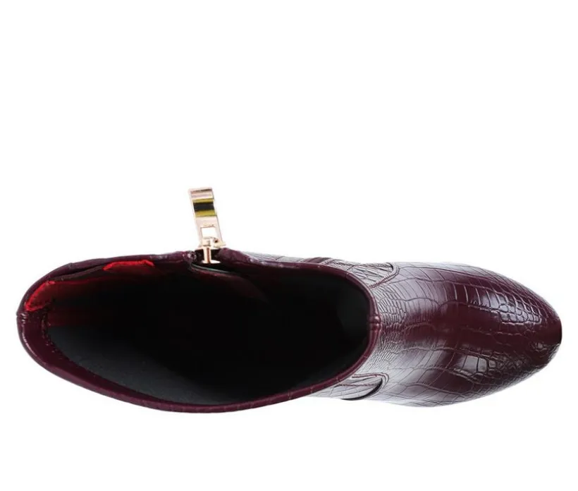 Pointed toe high block heel boot built on a raised platform, this ankle boot has gussets on the top adds to the fit. The back zipper opening makes it easy to wear.