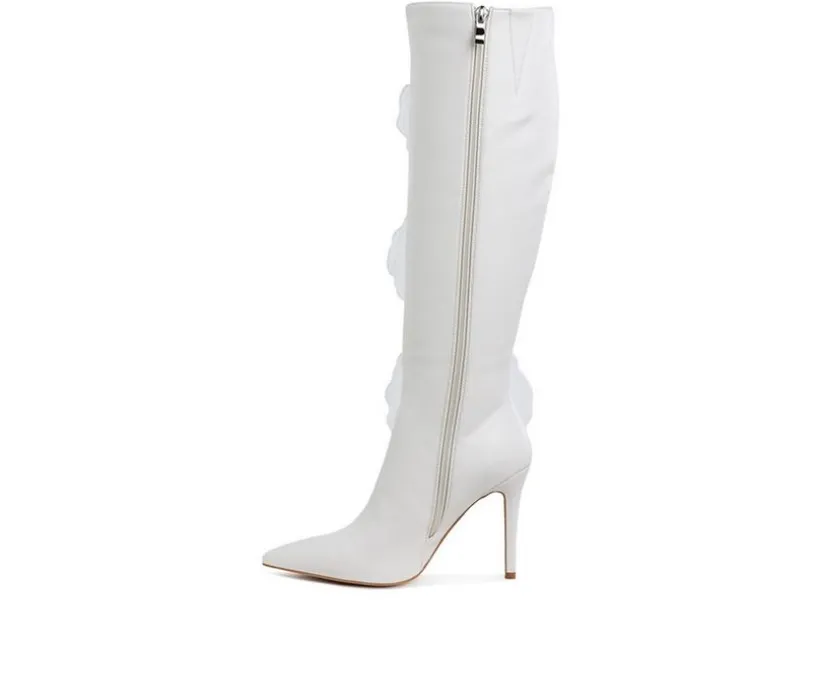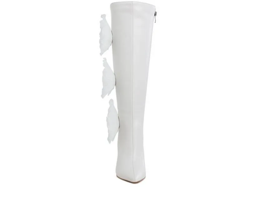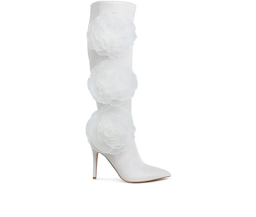 Romantic and daring, these long stiletto boots feature sheer rose detailing for an avant-garde edge. Made from faux leather with a comfortable cushioned insole and side zipper closure, they’re designed to stand out while keeping you stylishly supported.