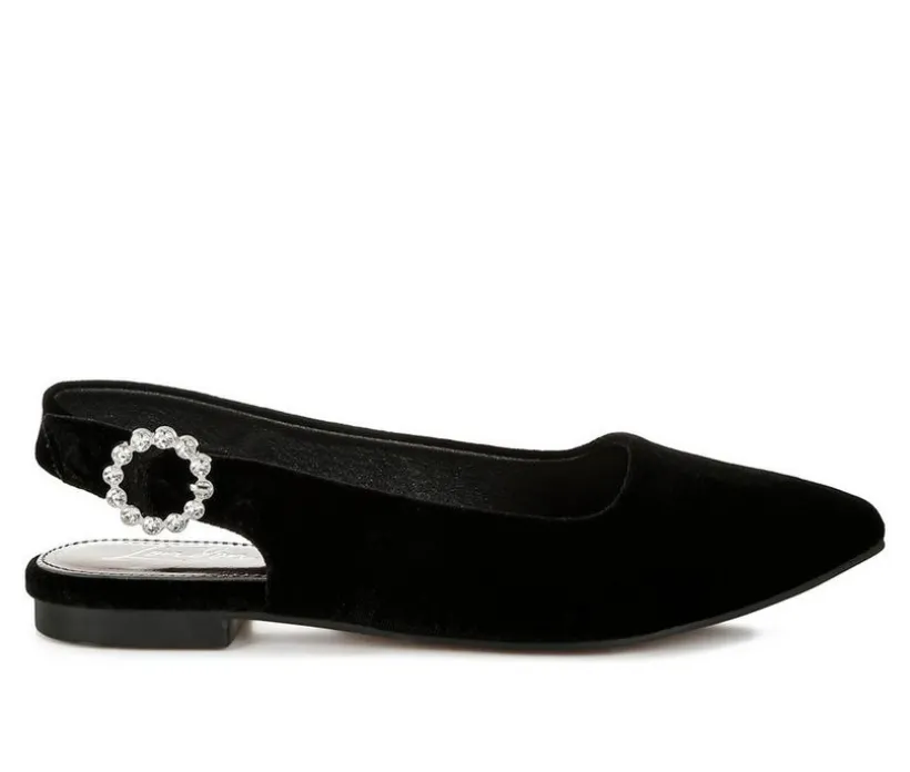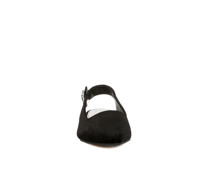 A luxe-looking flat with evening appeal, this velvet slingback features a pointed toe and rhinestone-trimmed buckle. The cushioned insole and low profile keep it wearable from reception to last dance. Elegant, fuss-free, and ready for dressy occasions.