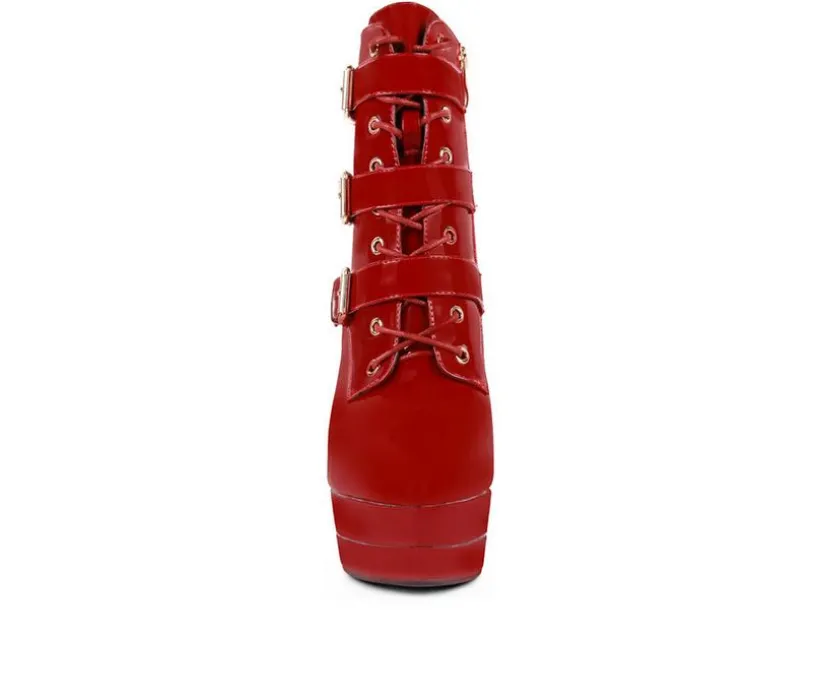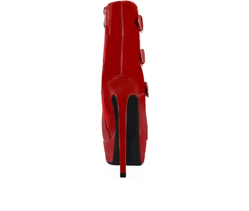 High Heeled Patent PU Stiletto Boot makes for statement wear and turns heads. The boot comes with easy to wear side zipper opening and the look is accentuated by high-quality metal hardware: three big pin buckles and eyelets which add to the design. The sharp-looking pointed-toe boot is worth every dollar spent! Type: Boot. Heel Type: Stiletto. Closed Pointed Toe. Upper Material: Patent PU. Lining: Synthetic. Outsole: Rubber. Statement Ankle Boot. Three Buckle Detail. Metallic Eyelet Detail. Side Zipper Opening. SH3413.