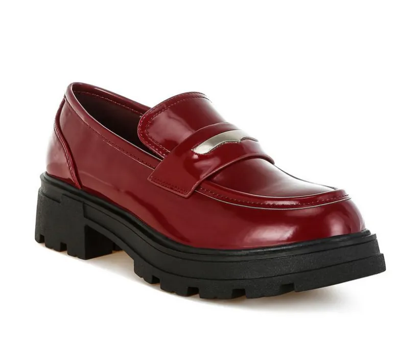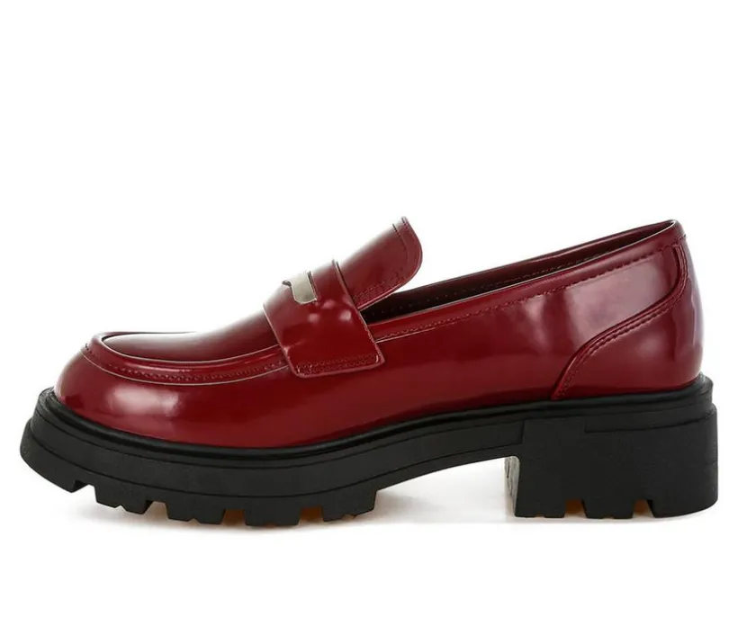 A chunky loafer with a modern edge. This bold style pairs a glossy faux patent upper with classic moc toe stitching and a thick lug sole for added height and attitude. An easy slip-on silhouette makes it a go-to for everyday dressing with a statement twist.