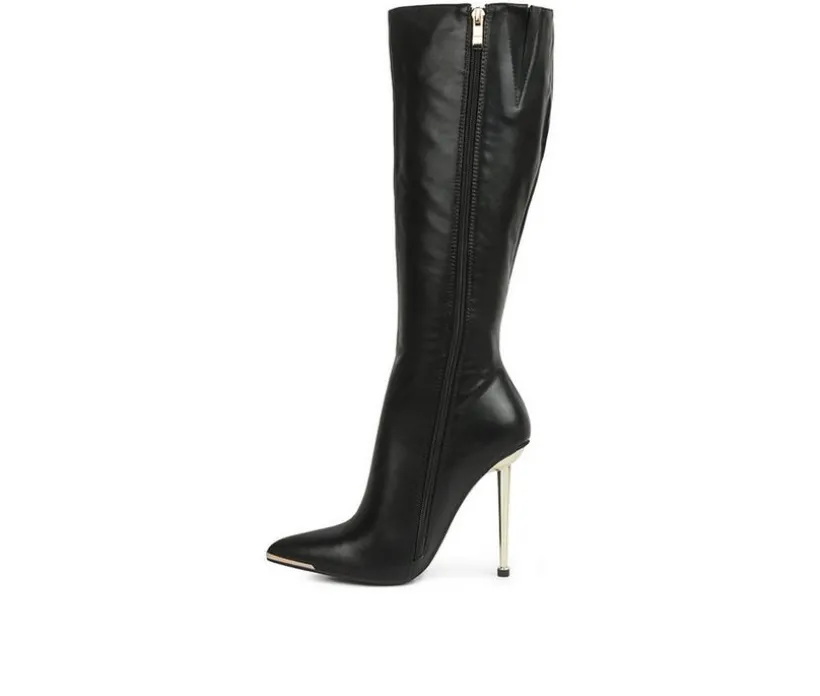 The knee-high boots are sleek and absolutely beautiful with the stiletto heels and metal lining pointed toe which also, compliments the metallic pointed high heel. Turn heads in style with these easy-to-wear winter boots which come with a side zipper opening.