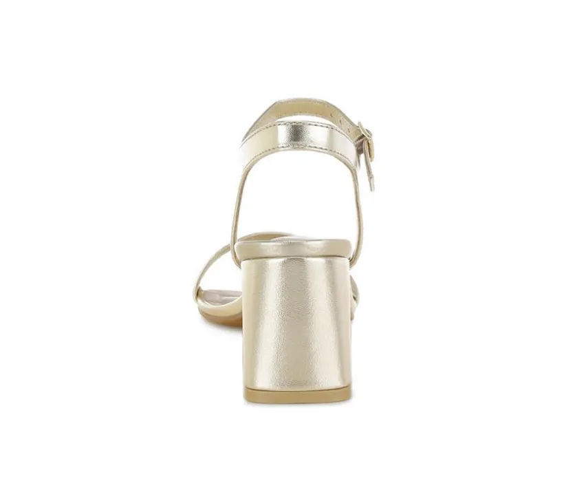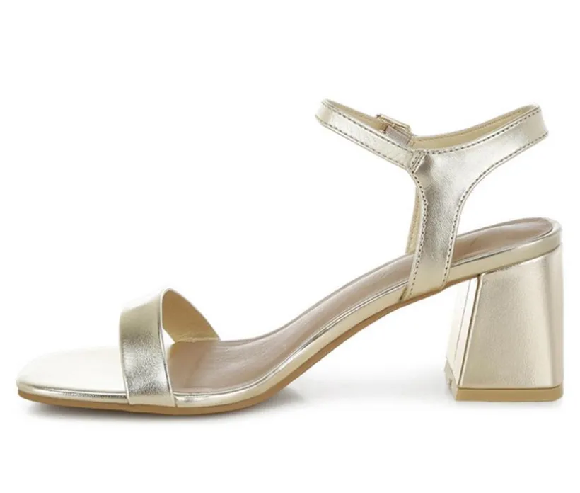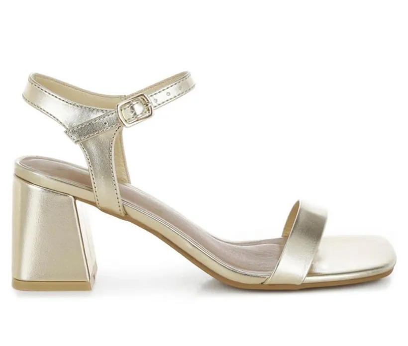 Add radiant flair to your evening with these metallic block heel sandals. The open square toe and pin buckle strap create a sophisticated, secure fit, while the cushioned insole ensures comfort through every event.