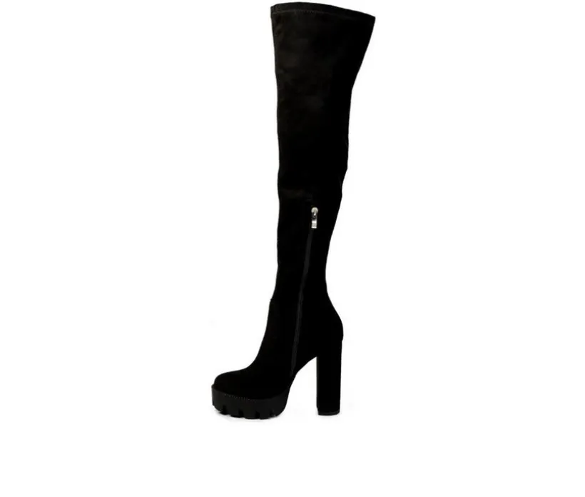 Be winter ready in the warming faux suede knee-high long boots. The high block heeled are supported on a lug sole platform which adds to the aesthetic and helps with height. It has a side zipper opening which makes it easy to wear. The elasticated gussets make the long boots fit.