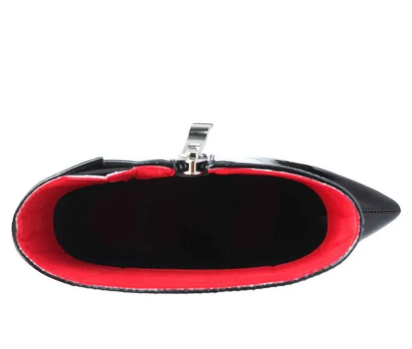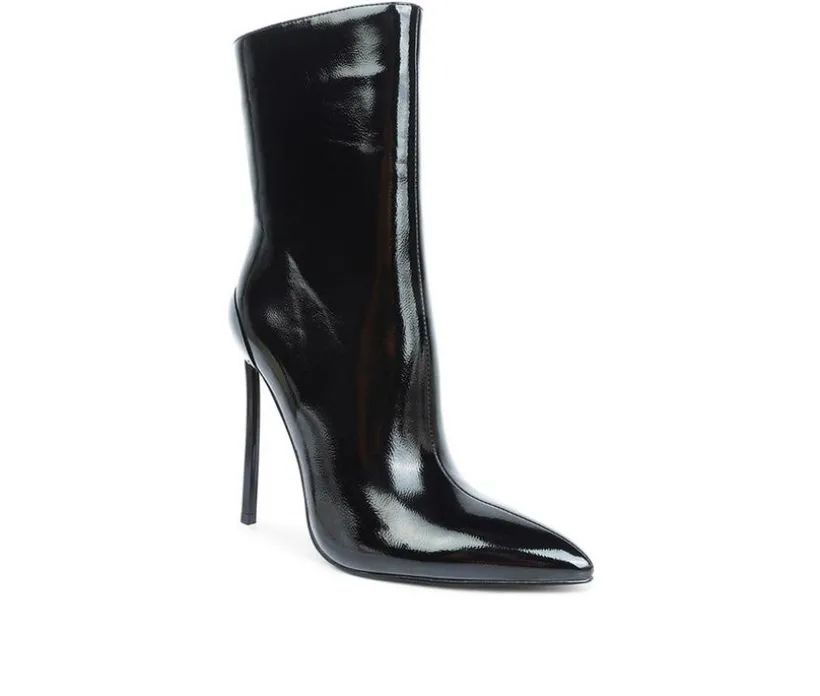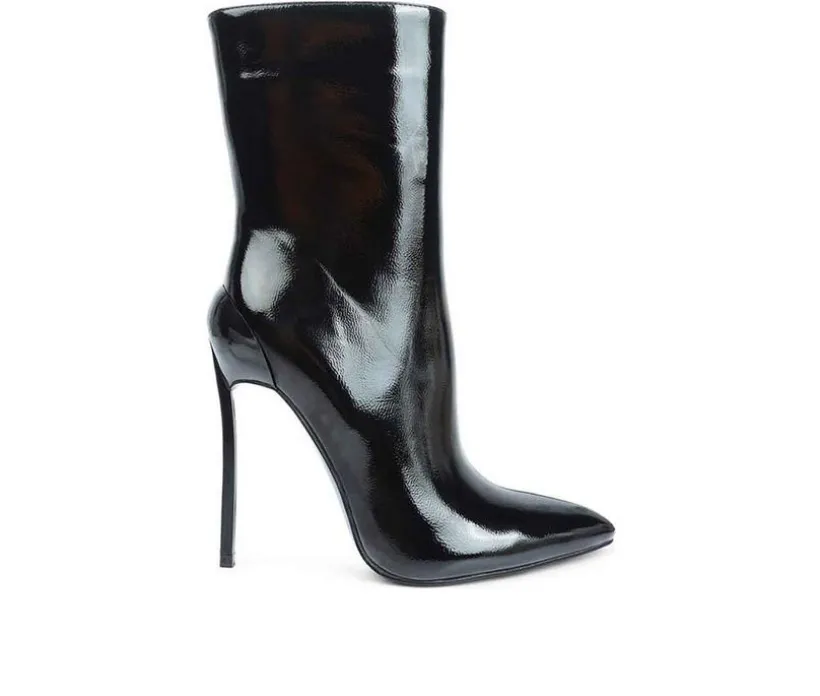 Sharp and bold: high pointies in patent PU are stunners! The high heeled ankle boot comes with pointed toe, structured heel cap and elegant aesthetic. It has elasticated Gussets which make it fit well, the side zipper facilitates