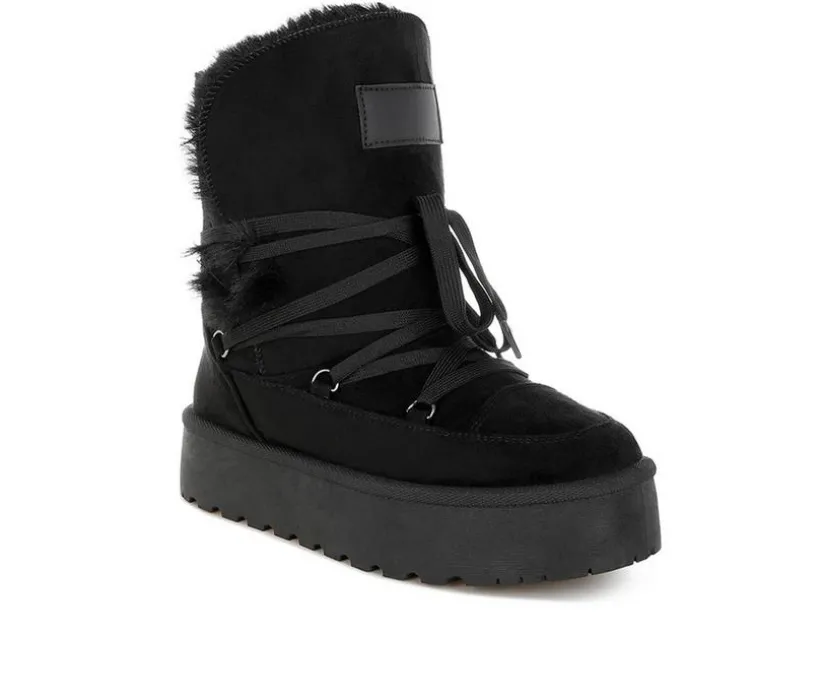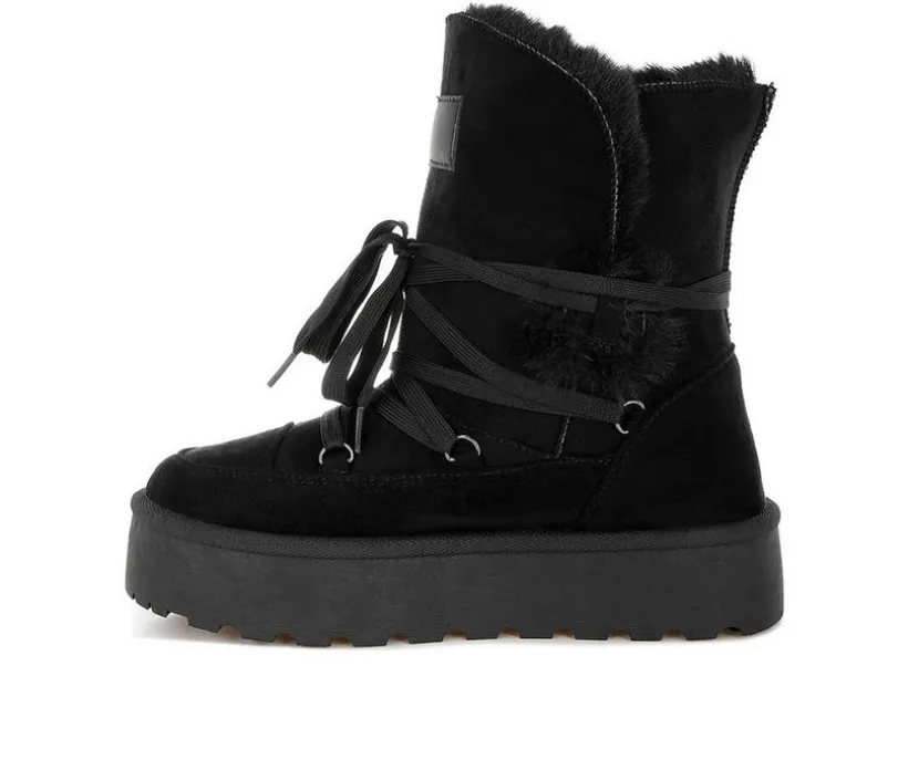 Stay snug and stylish in these cozy lace-up snow boots. Featuring soft faux fur detailing, flatform soles, and supportive cushioning, they’re built for cold-weather comfort and everyday wear. A lug outsole provides grip while the lace closure ensures a customizable fit.