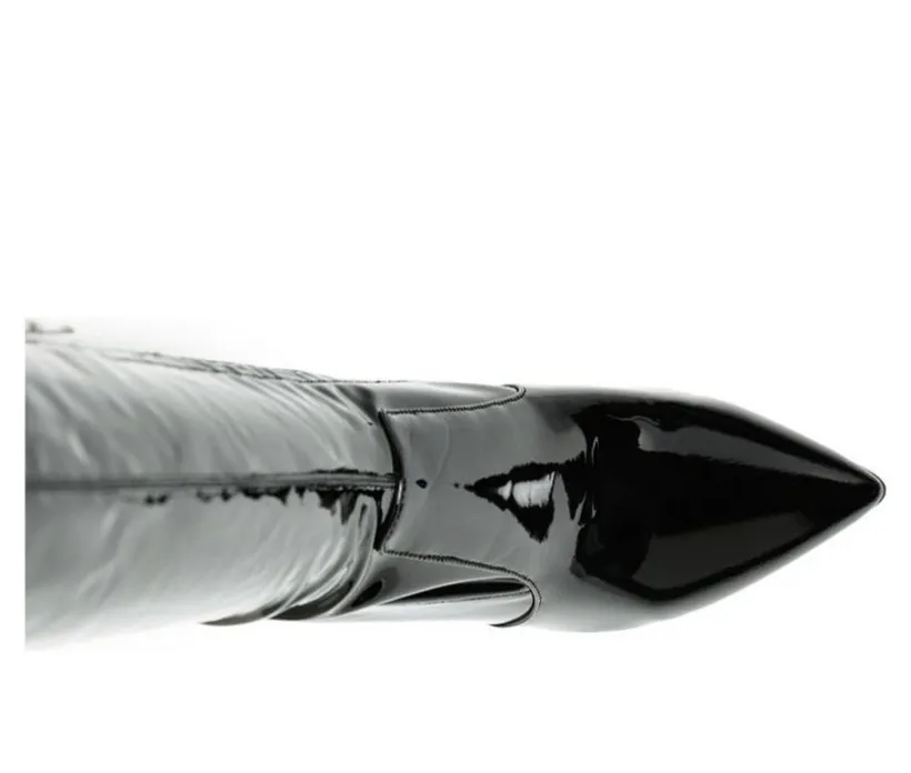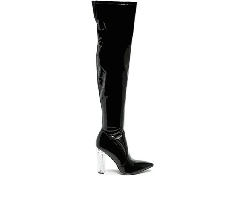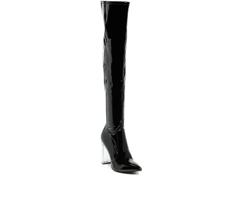 With clear block heels – this pair of patent PU thigh high boots scream style all way round. The pointed toe beauties seem to add some spark to grey winter moods.