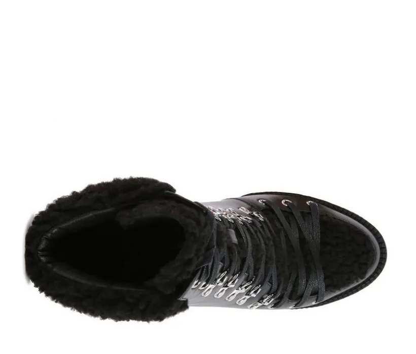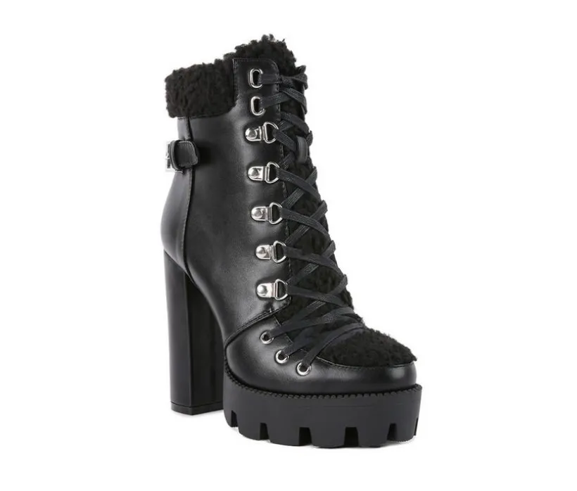 Chunky Sole High-Heeled Biker Boot made on a high platform. The stylish biker boot has metallic eyelets detail and comes with a side zipper opening. A stylish winter boot – it has faux shearling fur cushioned collar.