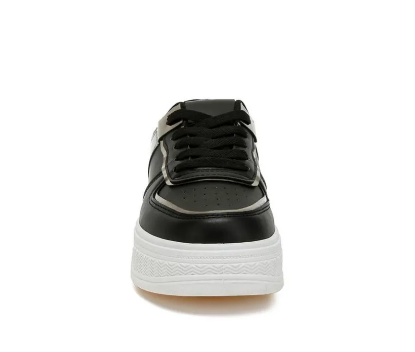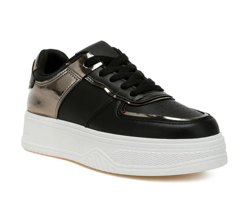 A bold mix of comfort and edge, these faux-leather sneakers pair a chunky flatform with gleaming metallic panels. The lace-up design secures your fit, while a cushioned insole keeps things easy through long days. Finished with a classic round toe and supportive TPR outsole, they add trendy height without the fuss. Wear them to instantly elevate casual looks.