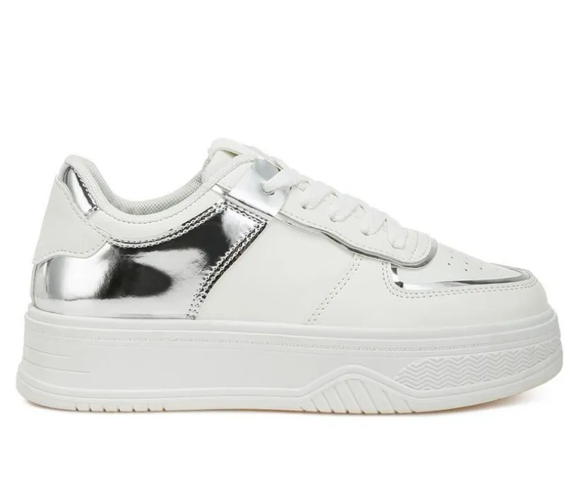 A bold mix of comfort and edge, these faux-leather sneakers pair a chunky flatform with gleaming metallic panels. The lace-up design secures your fit, while a cushioned insole keeps things easy through long days. Finished with a classic round toe and supportive TPR outsole, they add trendy height without the fuss. Wear them to instantly elevate casual looks.