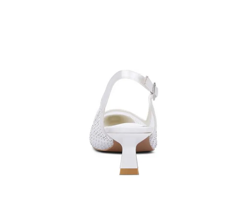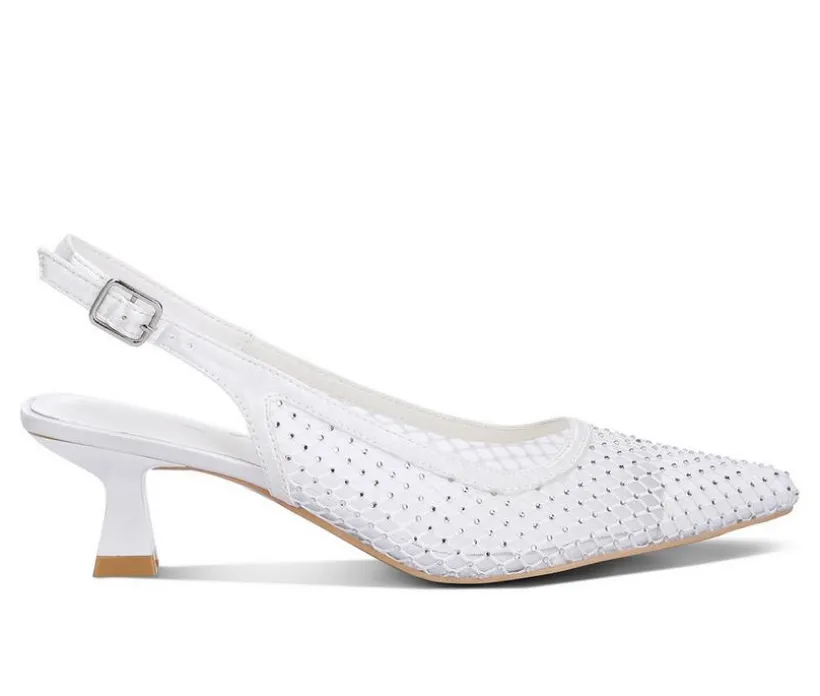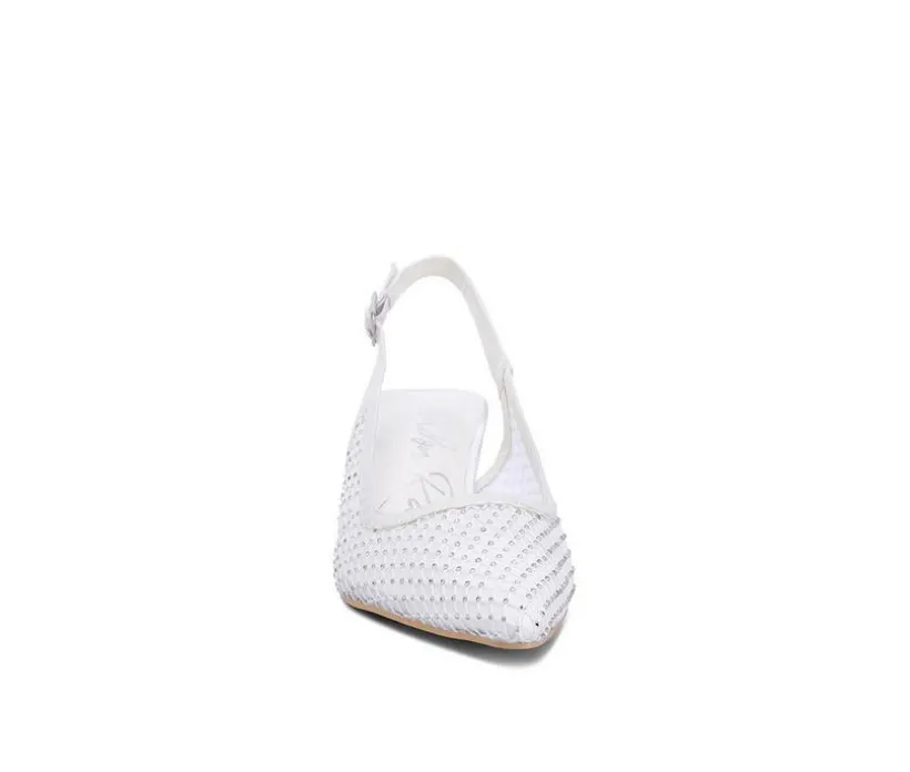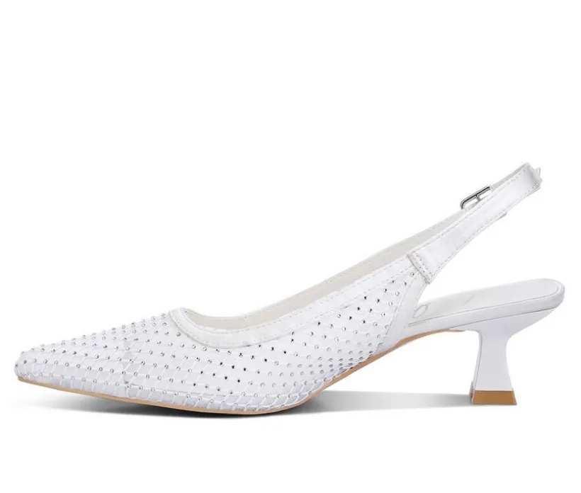 Stunning sling back heels with rhinestone details, a pointed toe, and a feminine kitten heel make this pair stand out in your shoe closet for all the right reasons!