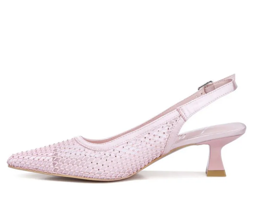 Stunning sling back heels with rhinestone details, a pointed toe, and a feminine kitten heel make this pair stand out in your shoe closet for all the right reasons!