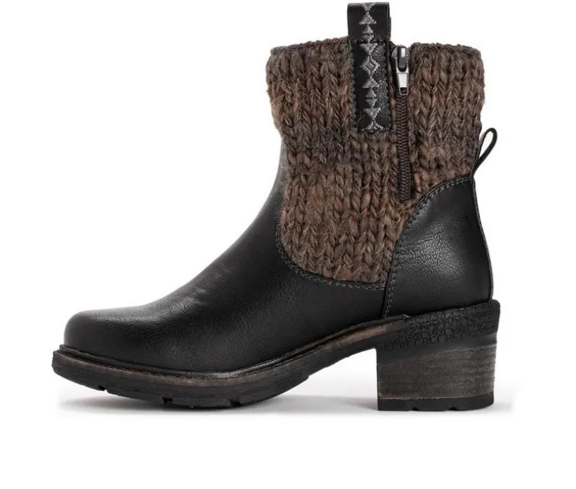 Hit the streets looking stylish in MUK LUKS® Women’s Arya Arlene Boots. With faux fur to keep you warm when temps drop and cozy memory foam insole, this sweet zip up boot will be the perfect addition to your fall weather wardrobe. Wipe with damp cloth. Lay flat to dry. Imported. Durable TPR Sole. 100% Polyester Faux Fur Insole. 50% Polyurethane, 50% Acrylic Knit. 100% Polyester Faux Fur Lining. Zip Up. Memory Foam Insole. Knit accent detail. 2.28’ Block Heel. Multiple Color Options. Women’s Sizes Whole and Half Sizes 6-11.