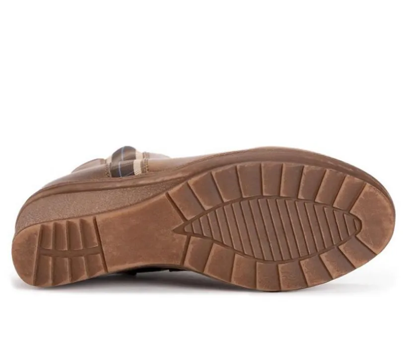 Make every step count in MUK LUKS® Women’s England Oxford Wedge. This wedge ankle bootie has a detailed plaid elastic gore that allows added flexibility for easy on and off while memory foam insoles offer you superior support and comfort all day long. Wipe with a damp cloth to clean, no bleach, lay flat to dry. Imported. Durable TPR Sole. 100% Polyester Faux Fur Insole. 100% Polyurethane Upper. 100% Polyester Faux Fur Lining. 2.5 Inch Wedge Heel. Memory Foam Insole. Multiple color options available. Women’s Whole and Half Sizes 6-11.