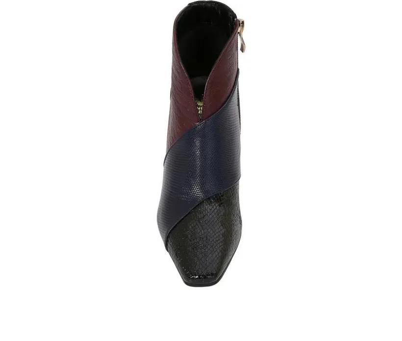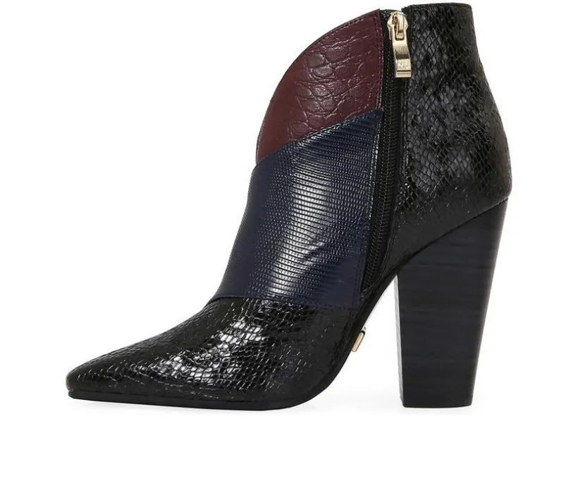 Make a statement in these bold ankle boots designed with a sharp, tapered silhouette. The man-made upper features a pointed toe and sleek lines that elongate the leg, while the inside zipper makes them easy to wear. A tall block heel adds dramatic lift, and the short shaft height gives them modern, versatile appeal for pairing with both denim and dresses.